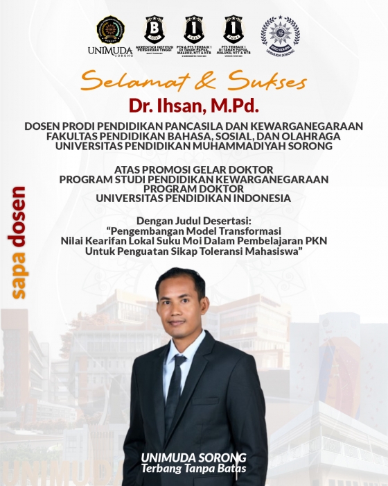 Bandung, 19 Agustus 2025 - Universitas Pendidikan Muhammadiyah Sorong (UNIMUDA Sorong) dengan bangga mengucapkan selamat kepada Dr. Ihsan, S.Pd., M.Pd., dosen Program Studi Pendidikan Pancasila dan Kewarganegaraan (PPKn) Fakultas Pendidikan Bahasa, Sosial, dan Olahraga, atas kelulusan program doktoral Pendidikan Kewarganegaraan dari Universitas Pendidikan Indonesia (UPI).